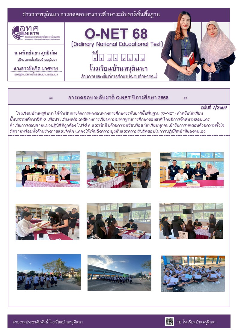 โรงเรียนบ้านพรุดินนา ได้ดำเนินการจัดการทดสอบทางการศึกษาระดับชาติขั้นพื้นฐาน (O-NET) สำหรับนักเรียนชั้นประถมศึกษาปีที่ 6 เพื่อประเมินผลสัมฤทธิ์ทางการเรียนตามมาตรฐานการศึกษาของชาติ โดยมีการจัดสนามสอบและดำเนินการสอบตามแนวปฏิบัติที่ถูกต้อง โปร่งใส และเป็นไปด้