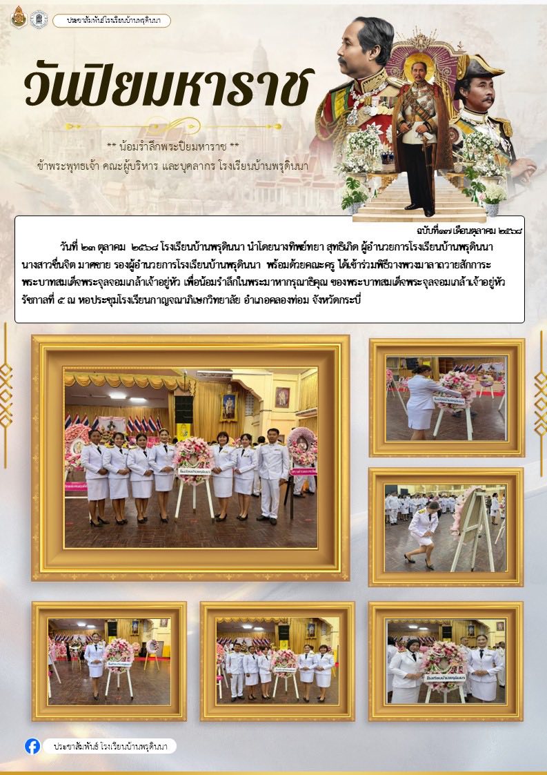23 ตุลาคม วันปิยมหาราช ประจำปี 2568 ✨ ผู้บริหาร ตัวแทนคณะครูและบุคลากรทางการศึกษา โรงเรียนบ้านพรุดินนา ร่วมพิธีวางพวงมาลาน้อมรำลึกเนื่องในวันคล้ายวันสวรรคตพระบาทสมเด็จพระจุลจอมเกล้าเจ้าอยู่หัว (วันปิยมหาราช) ประจำปี 2568