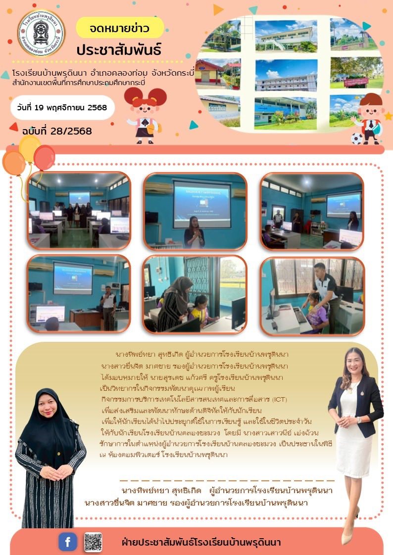 19 พฤศจิกายน 2568 นางทิพย์ทยา สุทธิเกิด ผู้อำนวยการโรงเรียน นางสาวชื่นจิต มาศชาย รองผู้อำนวยการโรงเรียน ได้มอบหมายให้นายสุรเดช แก้วศรี ครูโรงเรียนบ้านพรุดินนา เป็นวิทยากรในกิจกรรมพัฒนาคุณผู้เรียน กิจกรรมการบริการเทคโนโลยีสารสนเทศและการสื่อสาร ICT เพื่อใ