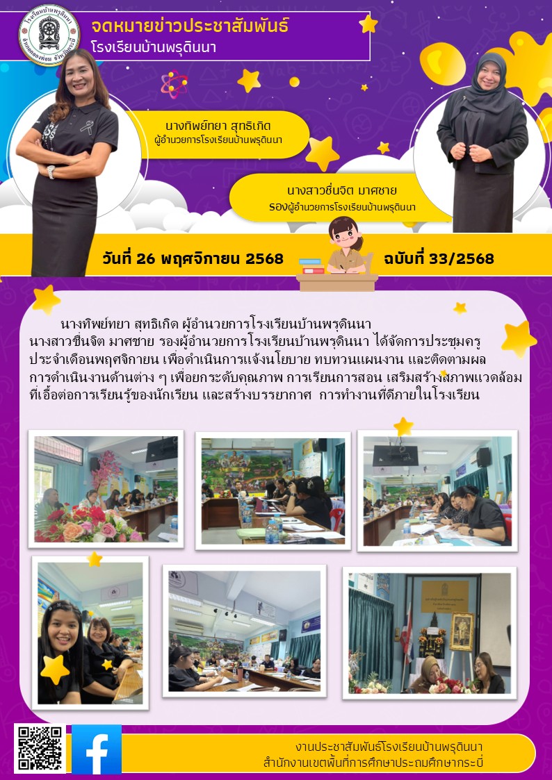 นางทิพย์ทยา สุทธิเกิด ผู้อำนวยการโรงเรียนบ้านพรุดินนา นางสาวชื่นจิต มาศชาย รองผู้อำนวยการโรงเรียนบ้านพรุดินนา ได้จัดการประชุมครูประจำเดือนพฤศจิกายน เพื่อดำเนินการแจ้งนโยบาย ทบทวนแผนงาน และติดตามผล การดำเนินงานด้านต่าง ๆ เพื่อยกระดับคุณภาพ การเรียนการสอน