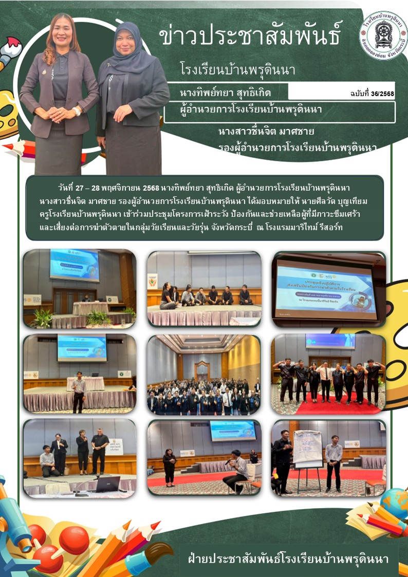 วันที่ 27 – 28 พฤศจิกายน 2568 นางทิพย์ทยา สุทธิเกิด ผู้อำนวยการโรงเรียนบ้านพรุดินนา นางสาวชื่นจิต มาศชาย รองผู้อำนวยการโรงเรียนบ้านพรุดินนา ได้มอบหมายให้ นายศีลวัต บุญเทียม ครูโรงเรียนบ้านพรุดินนา เข้าร่วมประชุมโครงการเฝ้าระวัง ป้องกันและช่วยเหลือผ