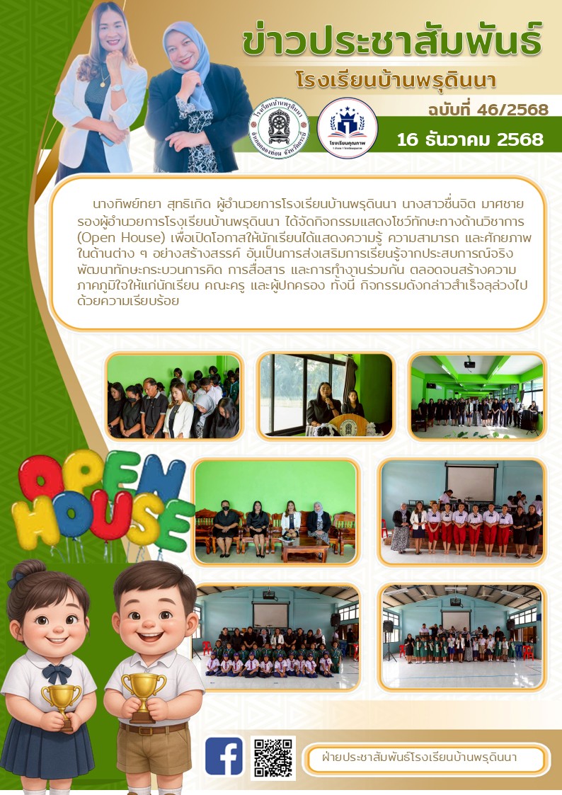 นางทิพย์ทยา สุทธิเกิด ผู้อำนวยการโรงเรียนบ้านพรุดินนา นางสาวชื่นจิต มาศชาย รองผู้อำนวยการโรงเรียนบ้านพรุดินนา ได้จัดกิจกรรมแสดงโชว์ทักษะทางด้านวิชาการ (Open House) เพื่อเปิดโอกาสให้นักเรียนได้แสดงความรู้ ความสามารถ และศักยภาพในด้านต่าง ๆ อย่างสร้างสรรค์ อ